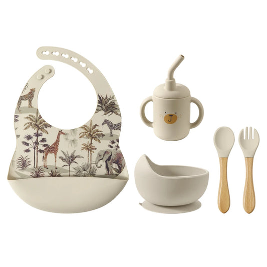 Silicone Baby Feeding Set BPA Free with Waterproof Bibs - Safari Sand