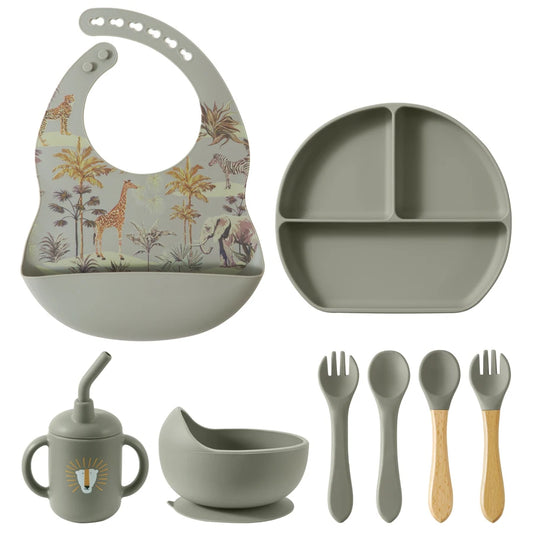 Silicone Baby Feeding Set BPA Free with Waterproof Bibs - Safari Sage