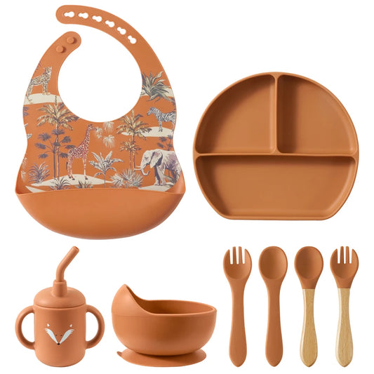 Silicone Baby Feeding Set BPA Free with Waterproof Bibs - Safari Orange