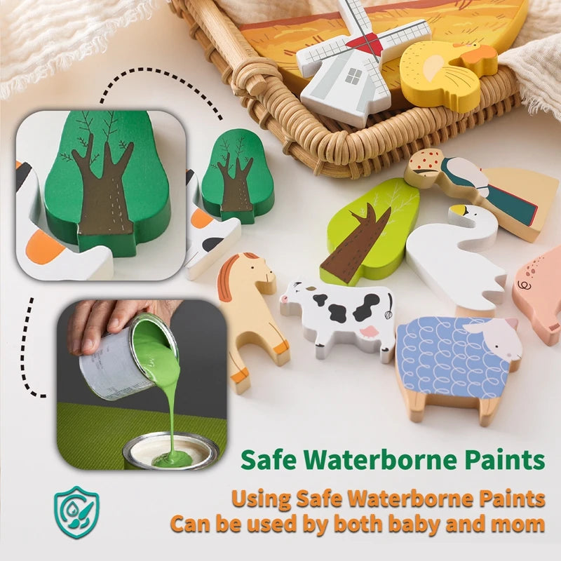 Each wooden block is crafted from durable, baby-safe wood with smooth edges, making it easy for small hands to grasp and stack. Children can practice balancing the blocks in fun ways, build towers, or create imaginative farmyard scenes while developing patience and concentration.
