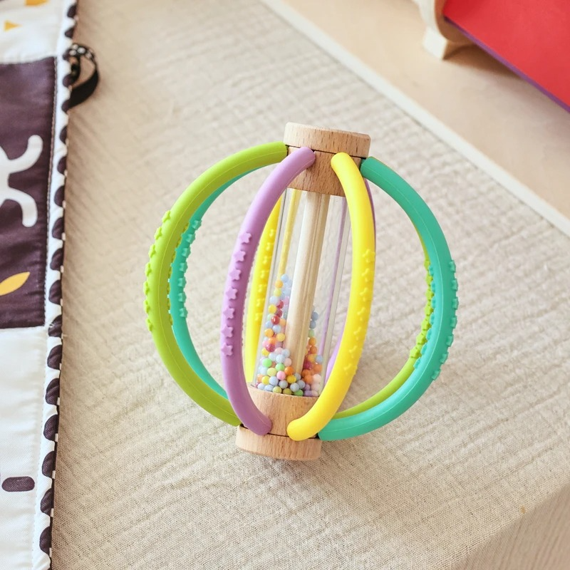 Soft Silicone Sensory Ball with Rattle Center: Encourages grasping, shaking, and listening — building fine motor and auditory skills.